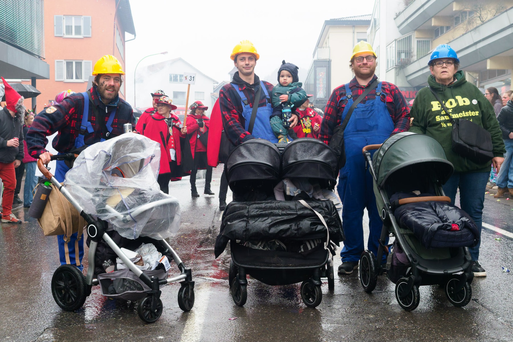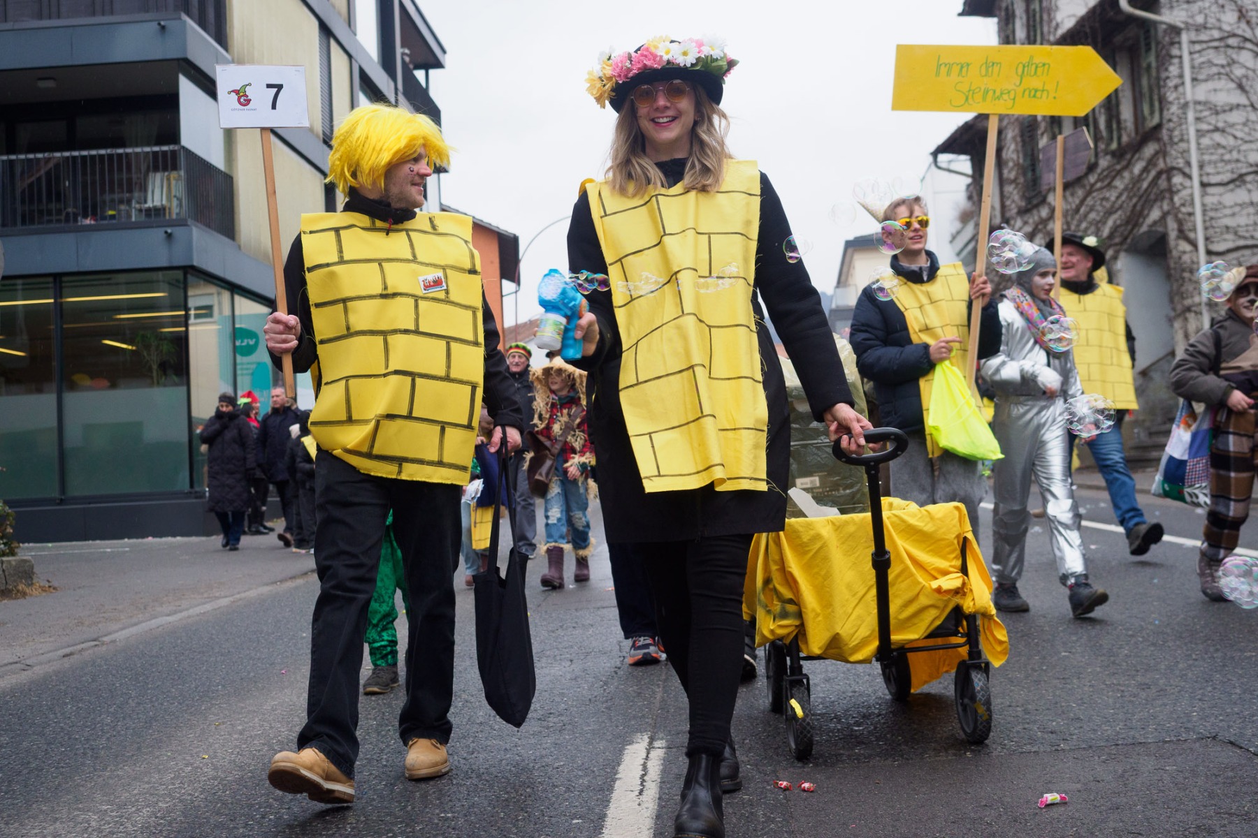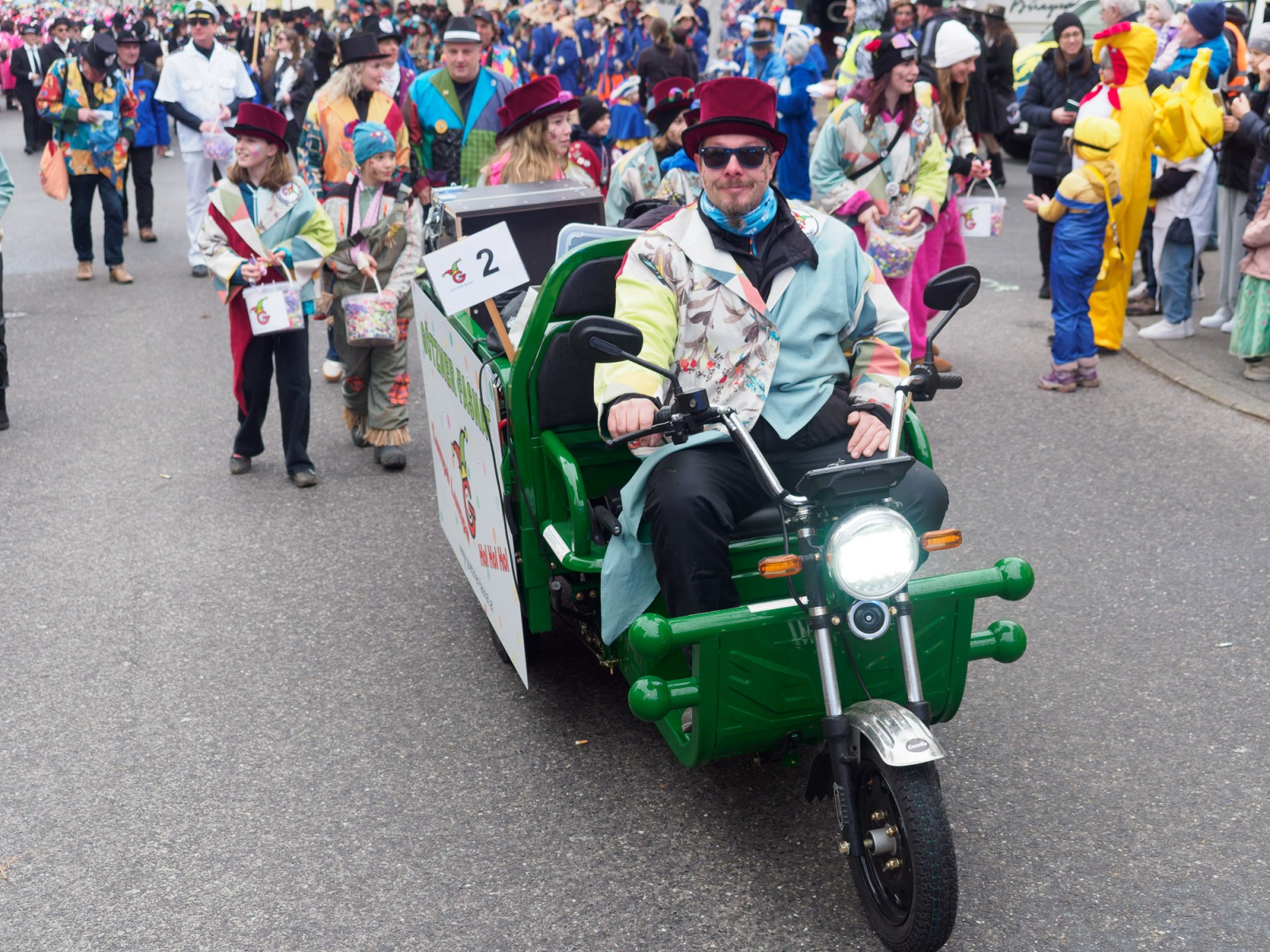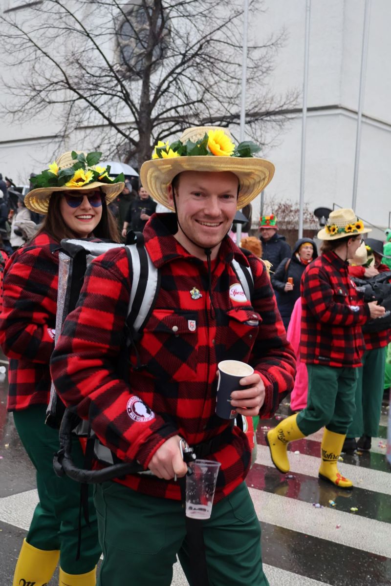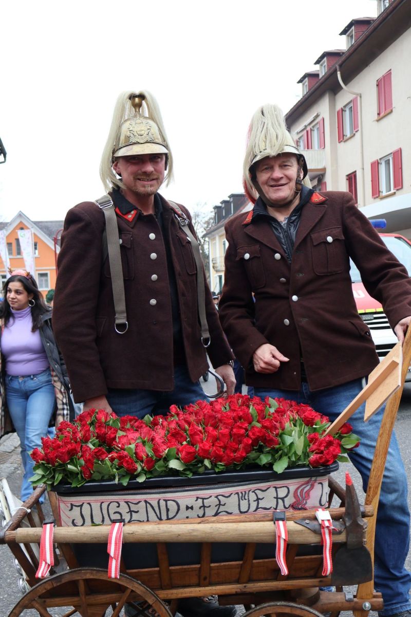 Angeführt wurde der Umzug von der Freiwilligen Feuerwehr Götzis mit Kommandant Rainer Büsel und seinem Vorgänger Eugen Böckle. Ihr Bollerwagen war nicht nur mit Löschutensilien, sondern auch mit Rosen bestückt, die an das Publikum verteilt wurden. Es folgten die Mitglieder der Götzner Fasnat, angeführt vom neuen Tuk-Tuk. Mit dabei waren auch Vizebürgermeister Christoph Längle sowie die Bürgermeister der Kummenbergregion – Gerhard Hölzl, Daniel Schuster und Markus Giesinger – ebenso wie Altbürgermeister Werner Huber. Für musikalische Stimmung sorgten die Bürgermusik Götzis und die Lumpamusik Götzis.